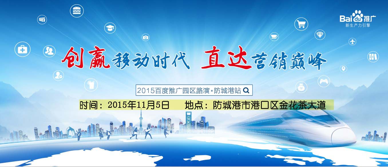 2015年11月5日,“创赢移动时代,直达营销巅峰”——2015百度推广园区路演·防城港站诚挚邀请您的参与,为您带来移动互联时代最新的营销理念,分享移动营销案例,帮助您拓展更广阔的市场,把握移动营销新商机,创赢移动时代新未来。