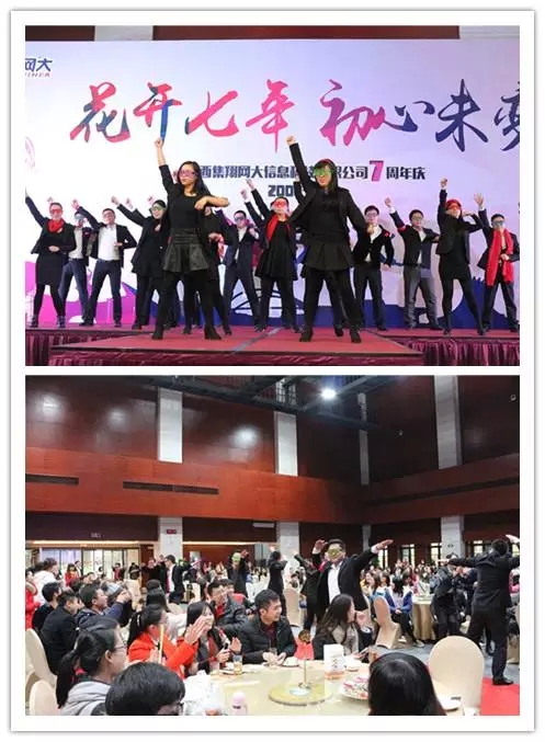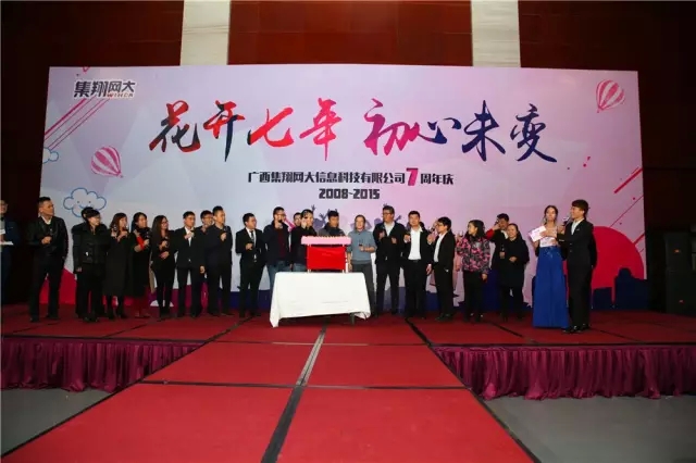 众里寻他千百度,那人却在集翔网大处,“花开七年,初心不变”广西集翔网大信息科技有限公司七周年庆典在五象山庄盛大举行,来自广西全区的伙伴在喜庆、祥和、热烈的氛围中,齐聚一堂,共庆网大的羊年辉煌,齐拓猴年大业!此次年会邀请集团董事长王小东先生、董事王青松先生和张浩雷先生、集团财务总监黄新茂先生、天津企商培训部经理刘莉女士出席,共同见证集翔网大的七周年生日。