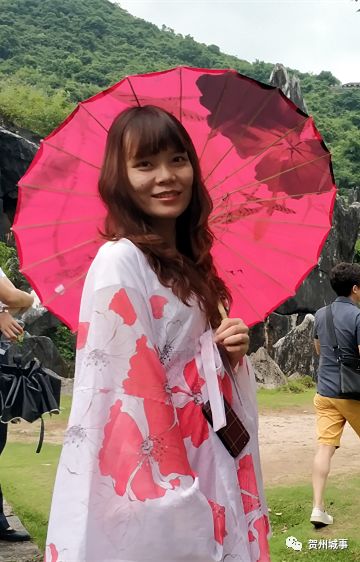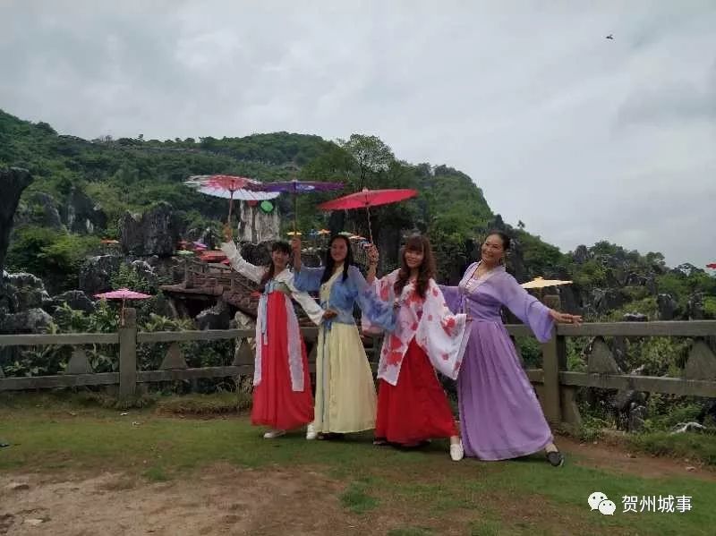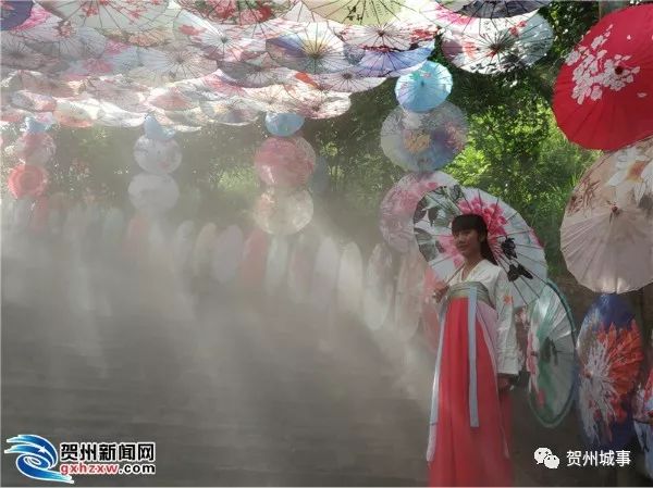 采风团来到位于平桂区的贺州玉石林景区,身着汉服的导游与一排排水墨丹青、古味浓郁的油纸伞组成的画面为这“石”仙境带来别样韵味。活动也为采风团成员们准备了汉服和油纸伞,这意外的准备激起了不少人的复古心,大家换上汉服,撑着油纸伞,纷纷投入到这大自然鬼斧神工之作中来。